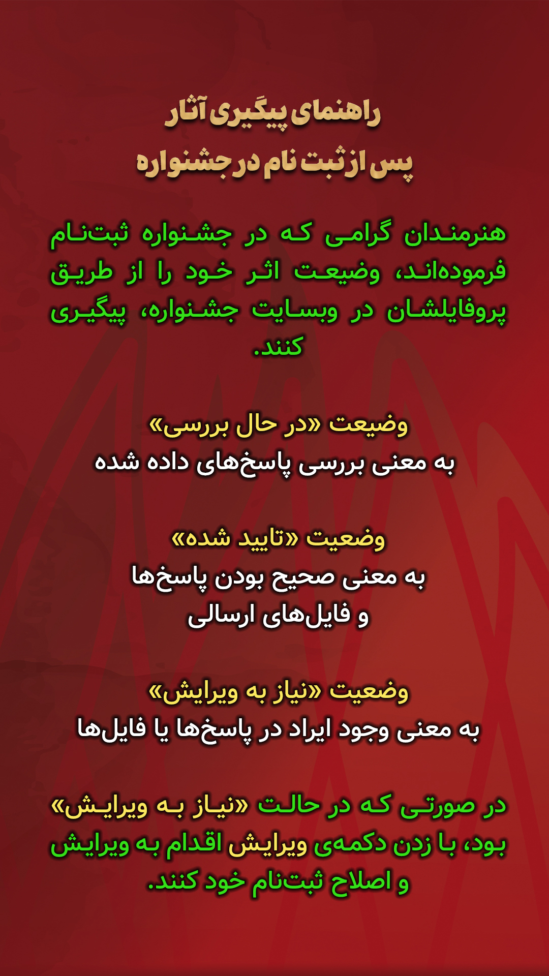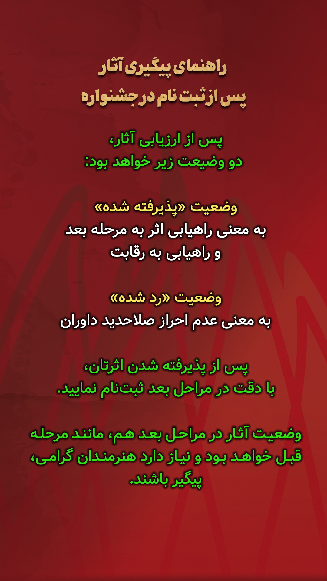 - اگر اطلاعات درخواست شده تا مهلت مقرر تکمیل نشود اثر در جشنواره ثبتنام نمیشود.
